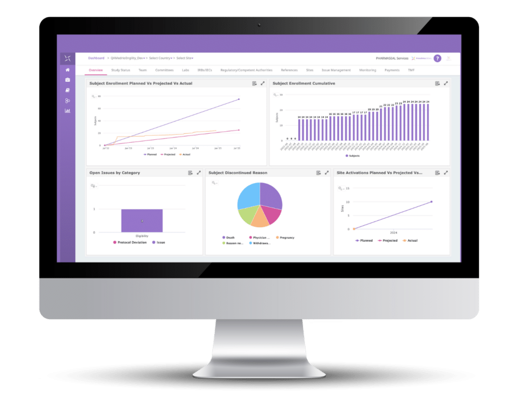 While an electronic data capture (EDC) system captures patient data, a clinical trial management system (CTMS) refers to managing operational data like enrollment, milestones, and quality metrics. Medrio’s core strength is a unified experience where EDC, ePRO, eConsent, RTSM, and CTMS integrate as one source of truth.